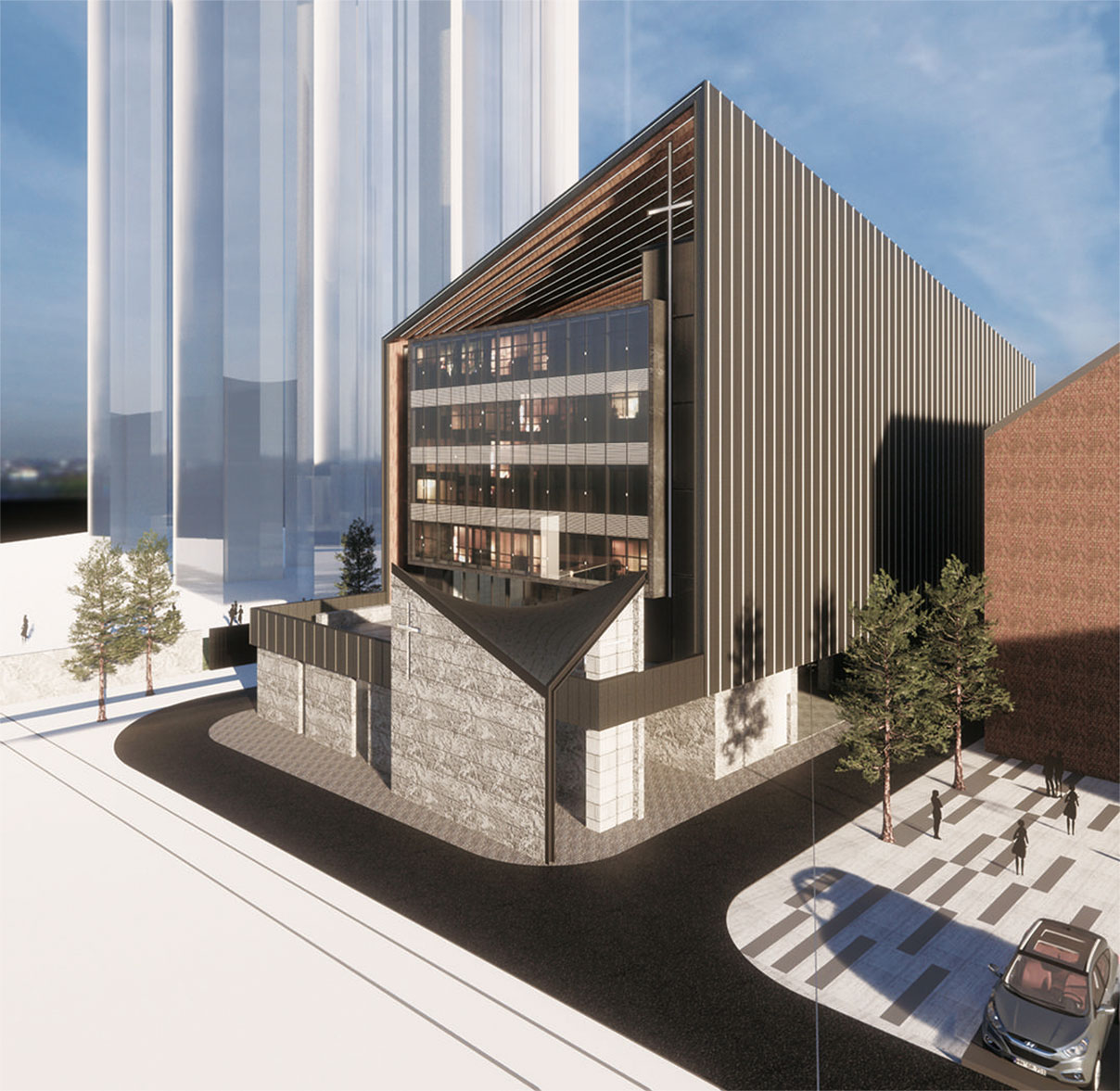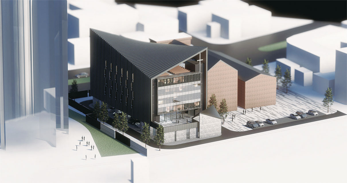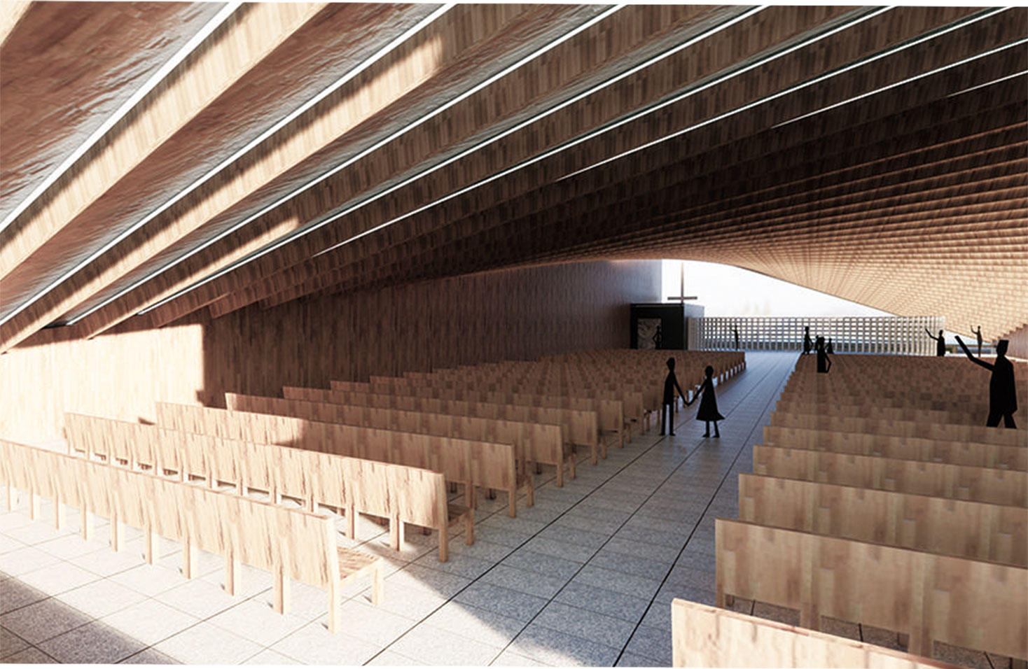 該項目位于福州市臺江區,毗鄰保留建筑(江濱西大道285號),閩江沿岸,由于地塊狹長,教堂平面采用了簡單的矩形,既符合教堂的使用功能,又協調了周邊的場地;建筑體量上簡潔明朗,最大的特點是使用了雙曲面的金屬屋頂, 它讓人感受到了鳥的輕盈和它翱翔時翅膀的張力,夸張的曲線造型,象征著向天空展開的張力,使教堂的辨識度大大增加, 單坡的雙曲面屋頂和旁邊的保留建筑屋頂協調統一,豐富了沿道路和沿江的城市天際線,建成后將可成為區域的地標性建筑。