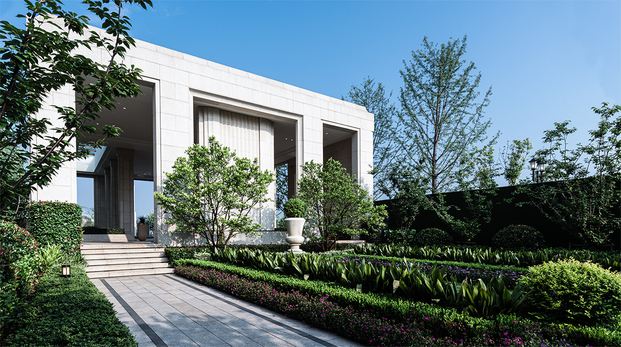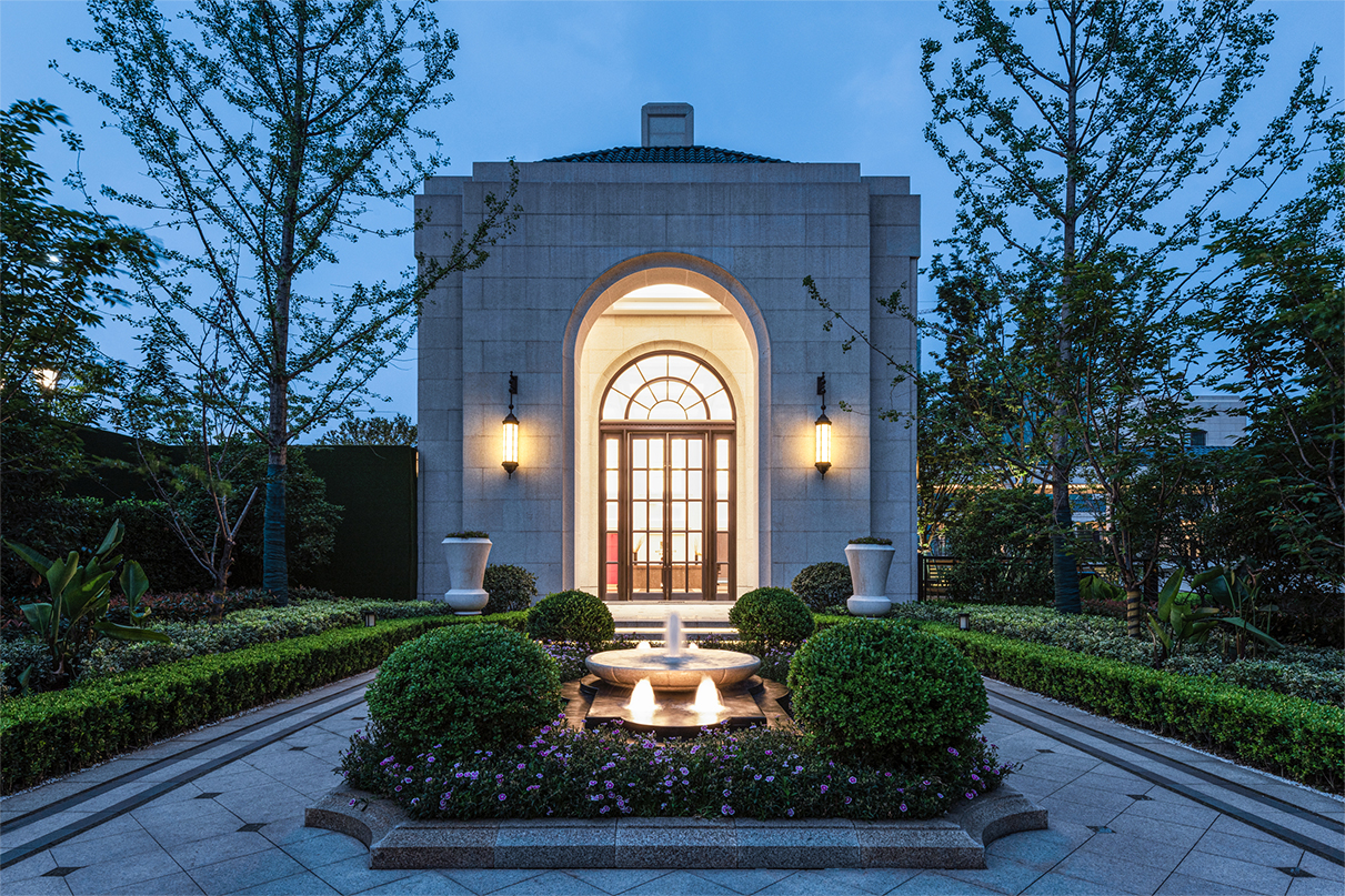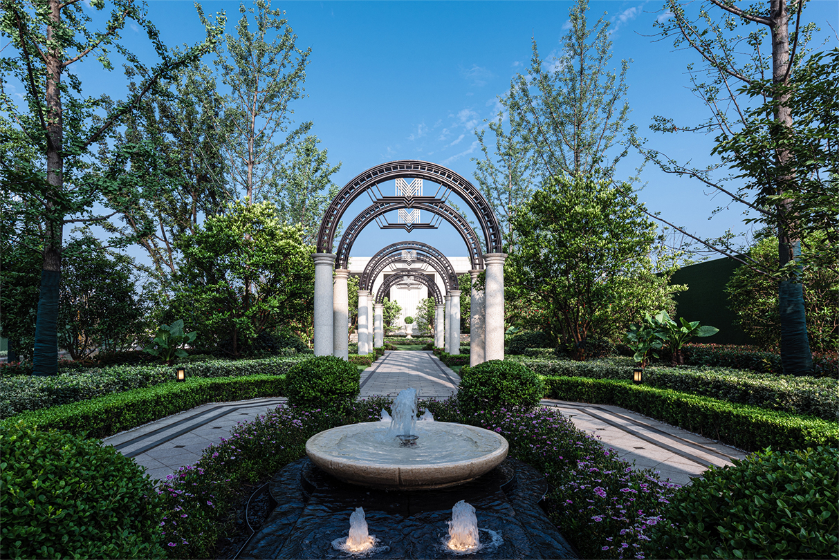 從西側到達廣場開始,植被陣列清晰界定了廣場的邊界,中心的logo鐘樓昭示了場地精神。整形綠籬、草花和草坪帶來的柔性松弛感,同迎賓大廳硬朗的儀式感形成有趣的對比,暗喻從西裝革履的外面的世界回到了自在溫馨的家的心理轉換。
