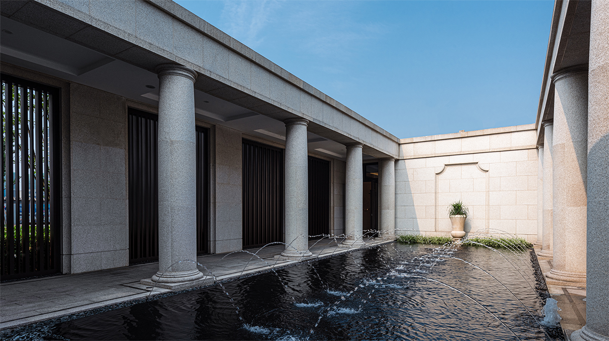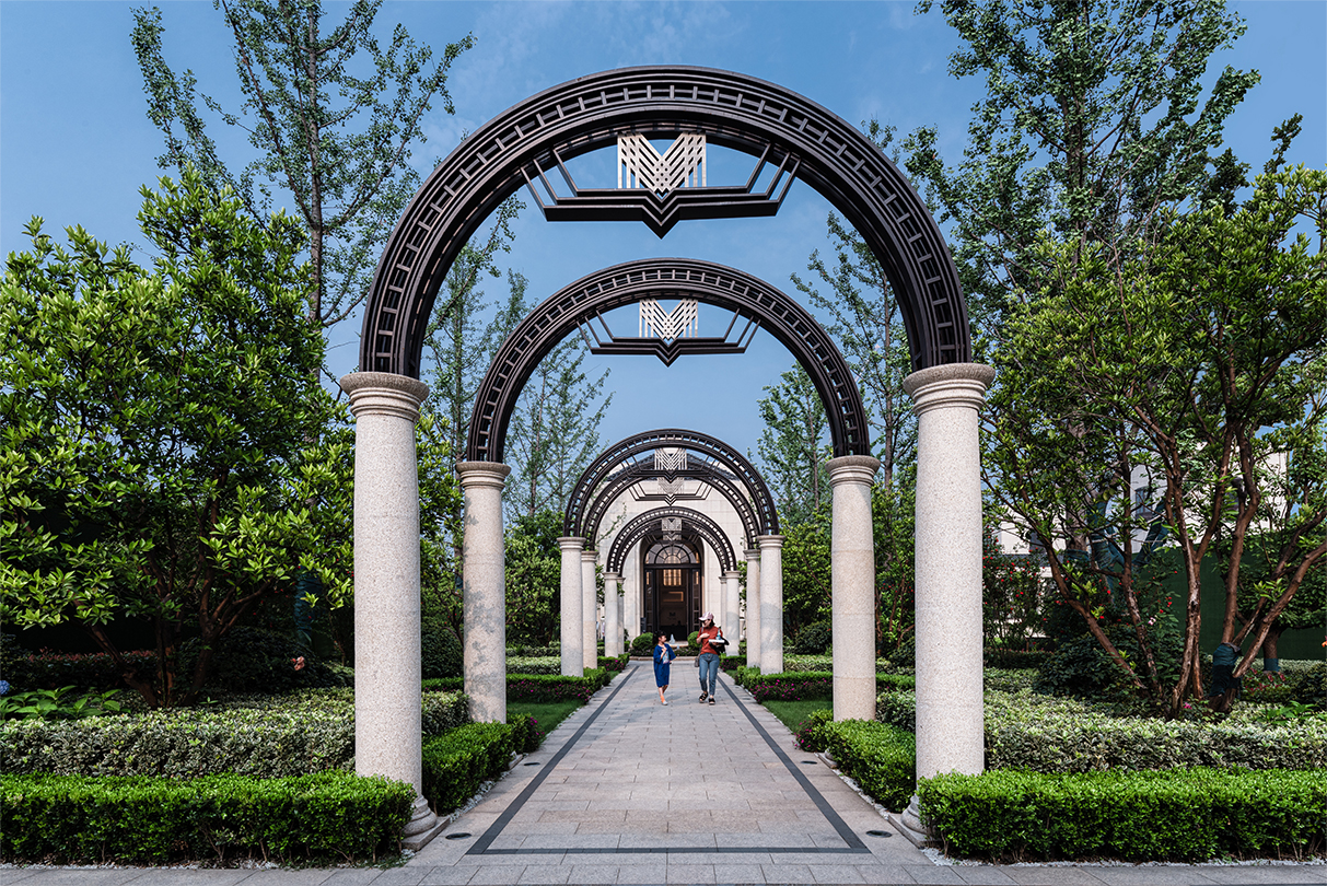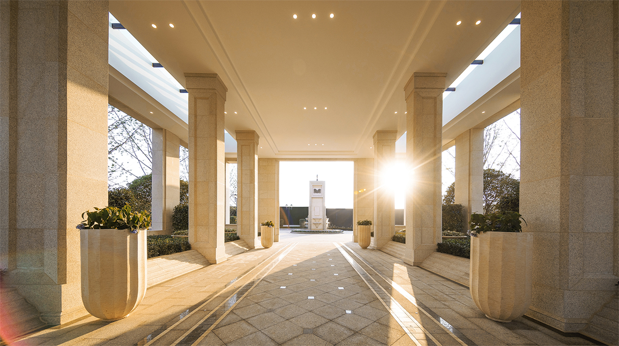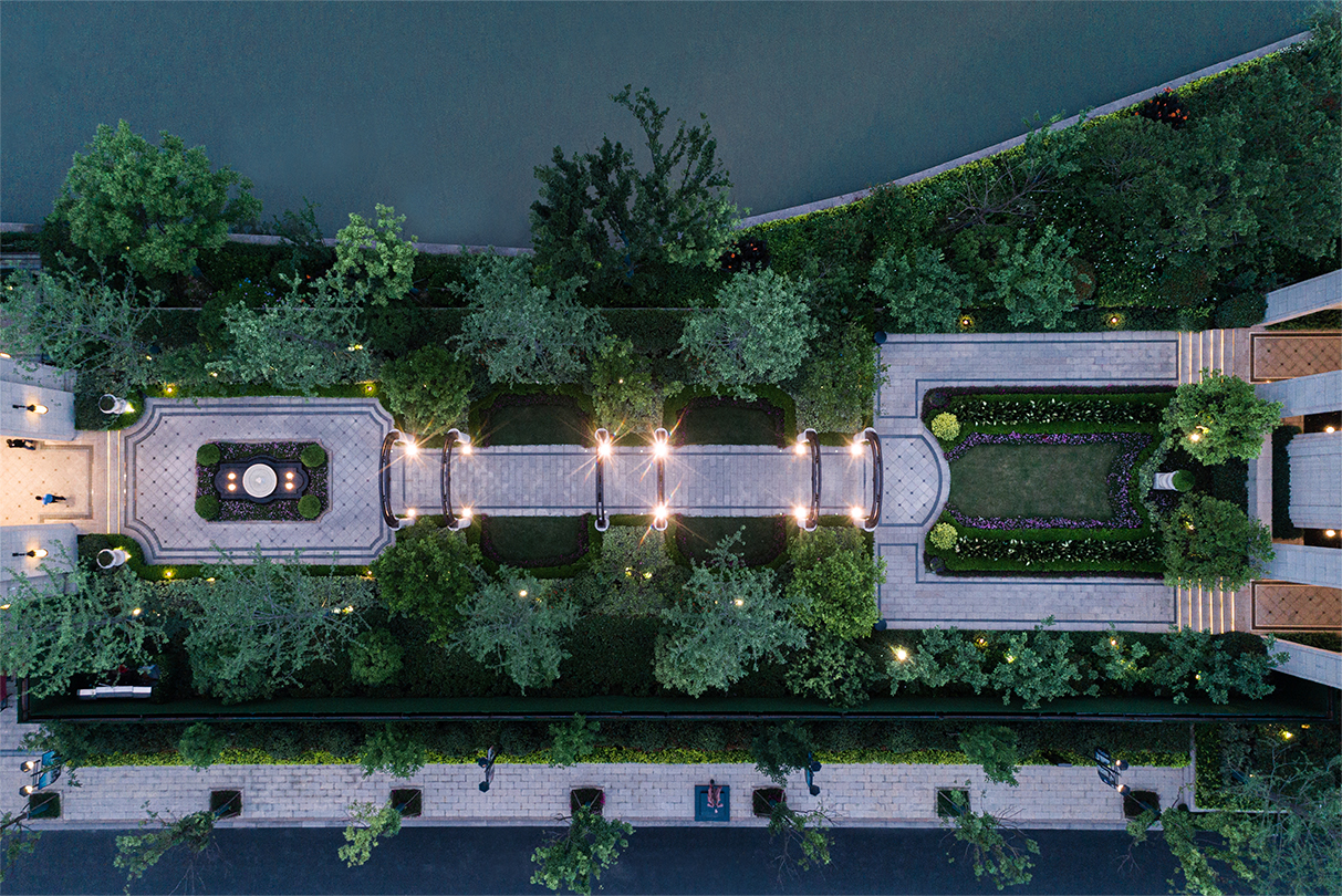 從西側到達廣場開始,植被陣列清晰界定了廣場的邊界,中心的logo鐘樓昭示了場地精神。整形綠籬、草花和草坪帶來的柔性松弛感,同迎賓大廳硬朗的儀式感形成有趣的對比,暗喻從西裝革履的外面的世界回到了自在溫馨的家的心理轉換。