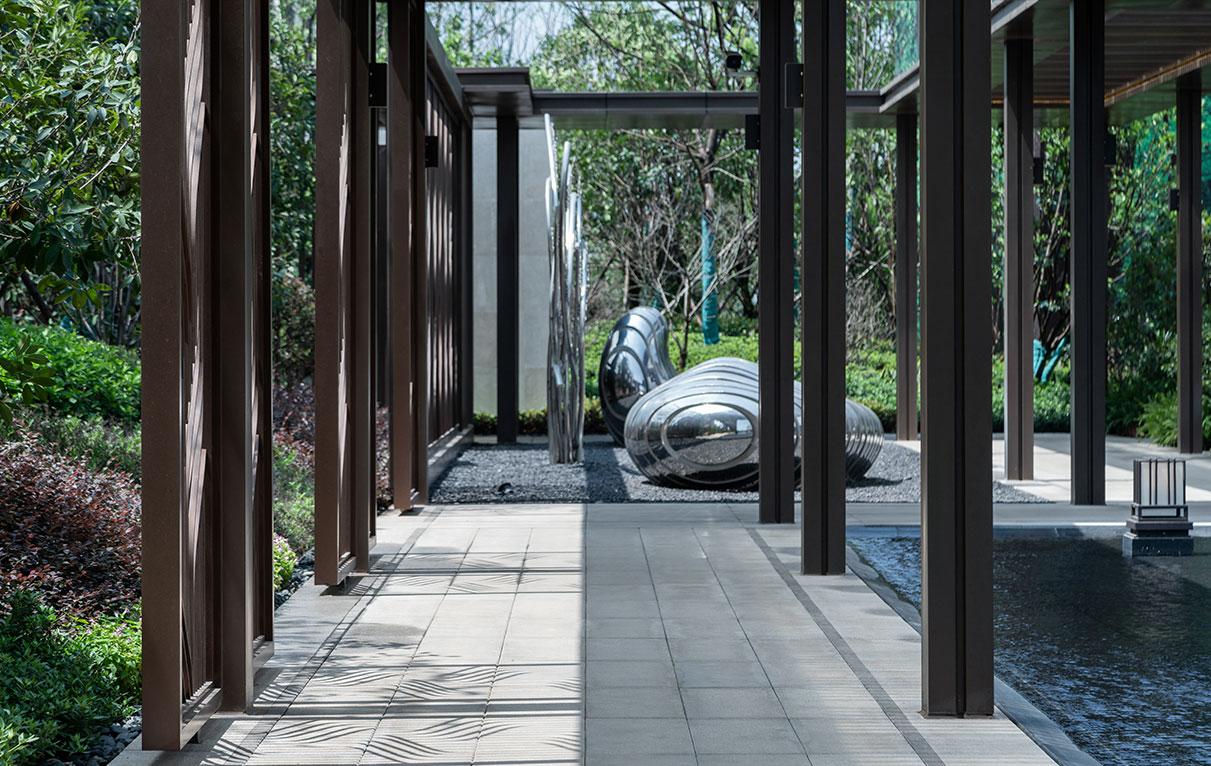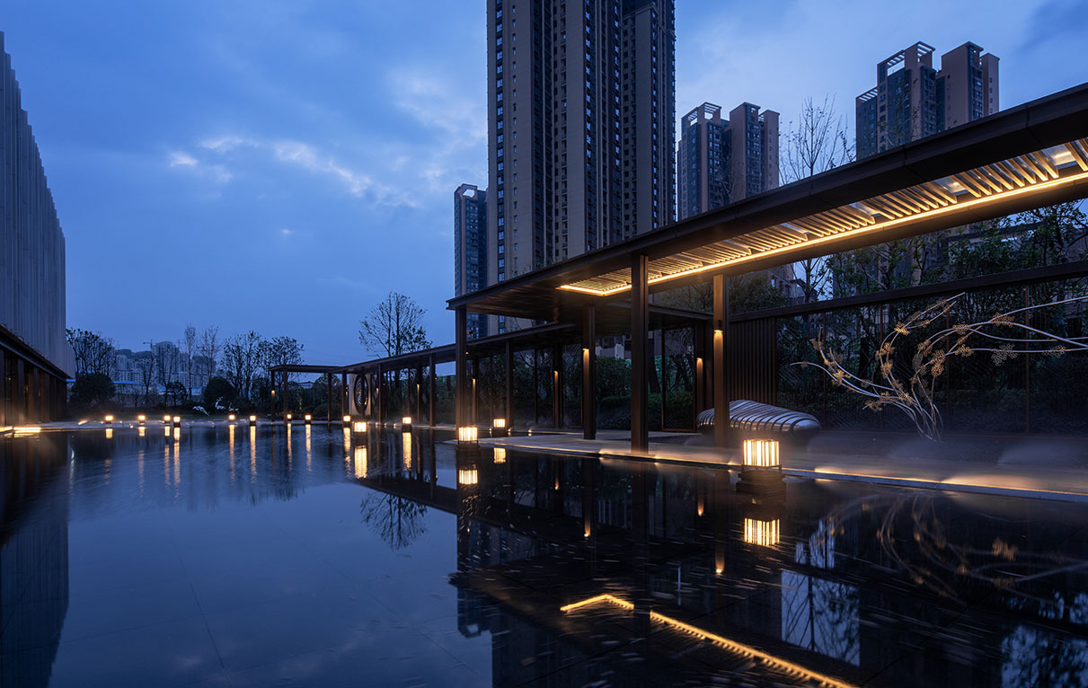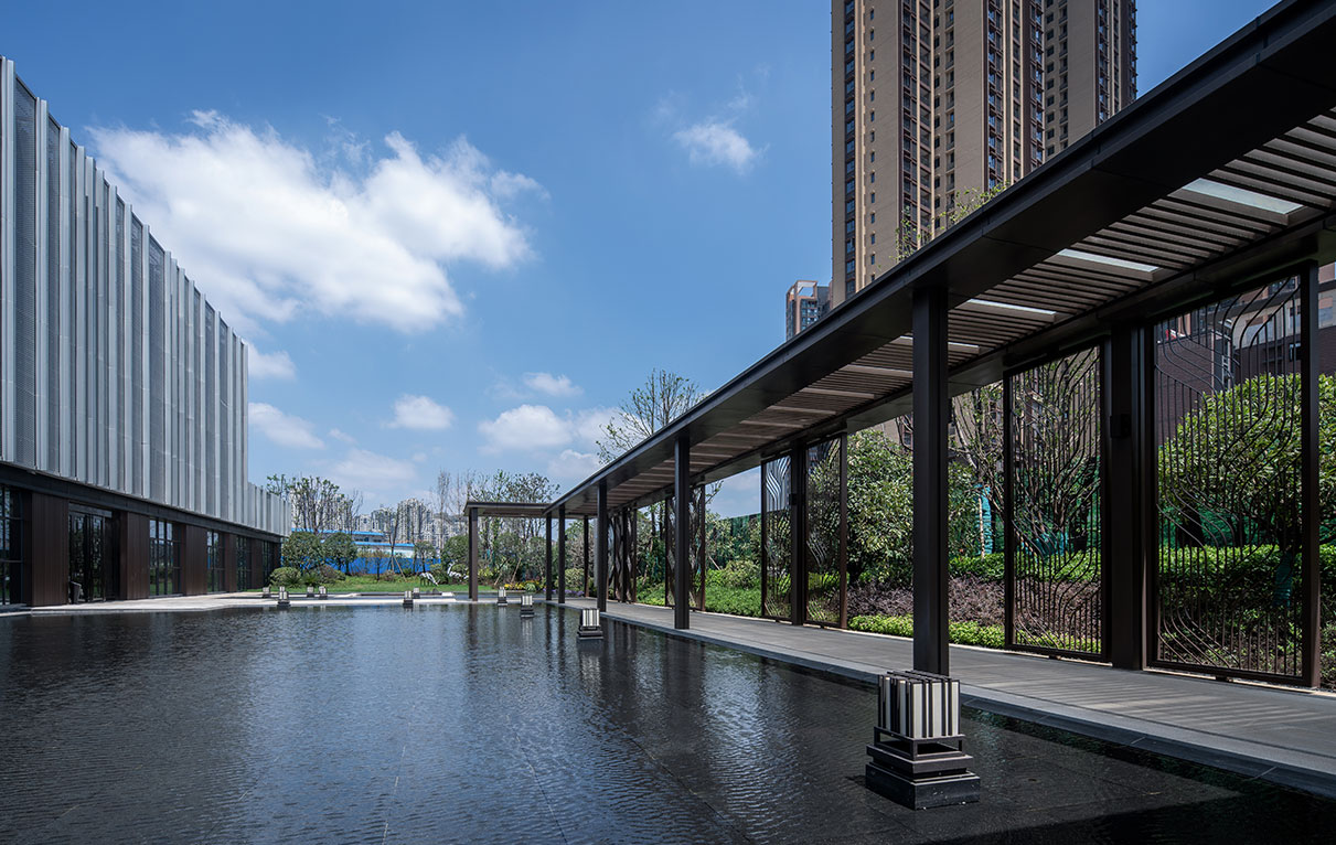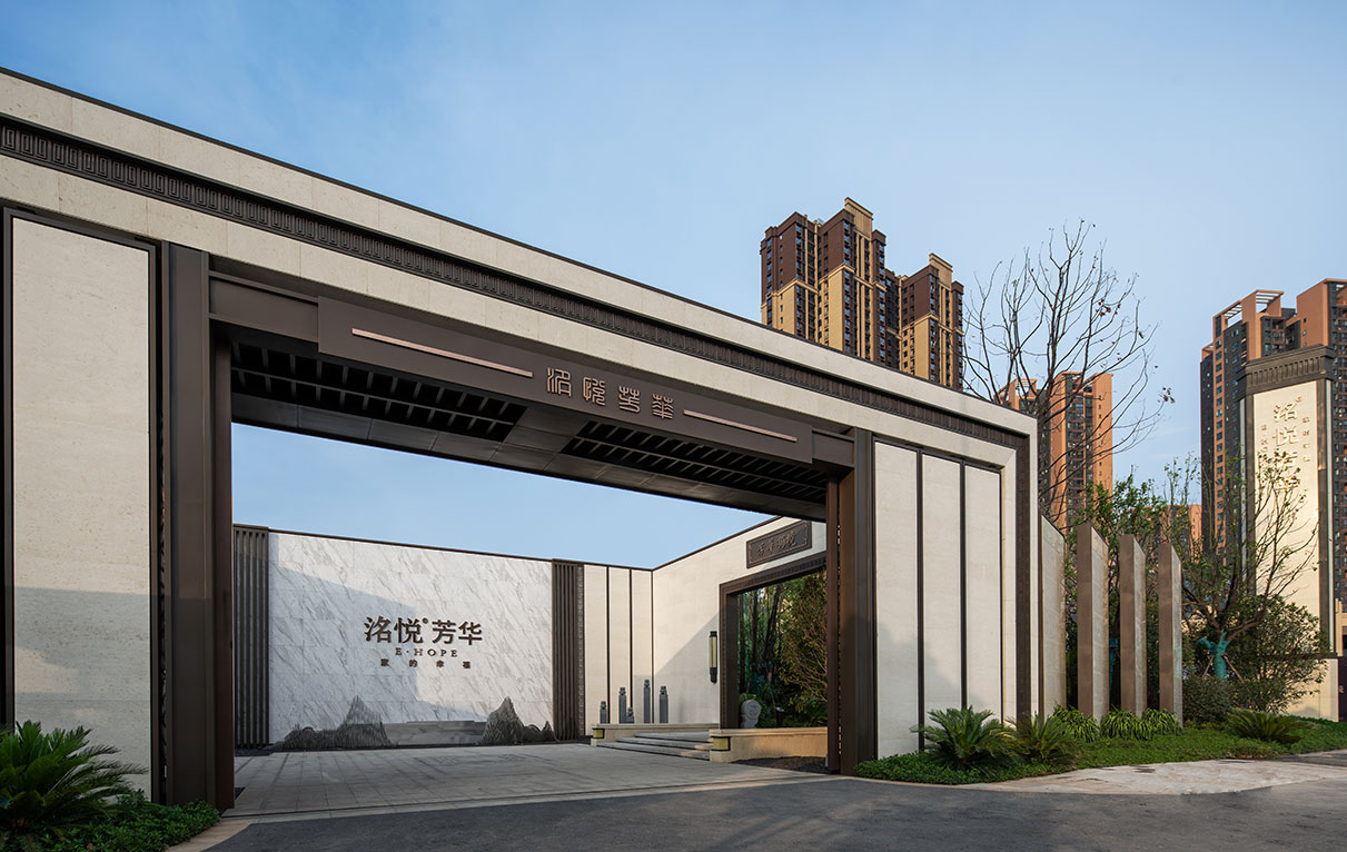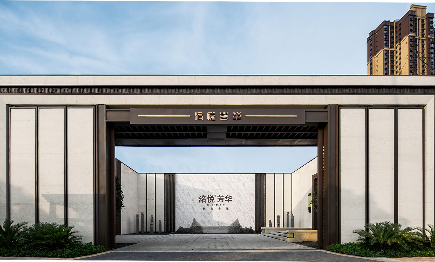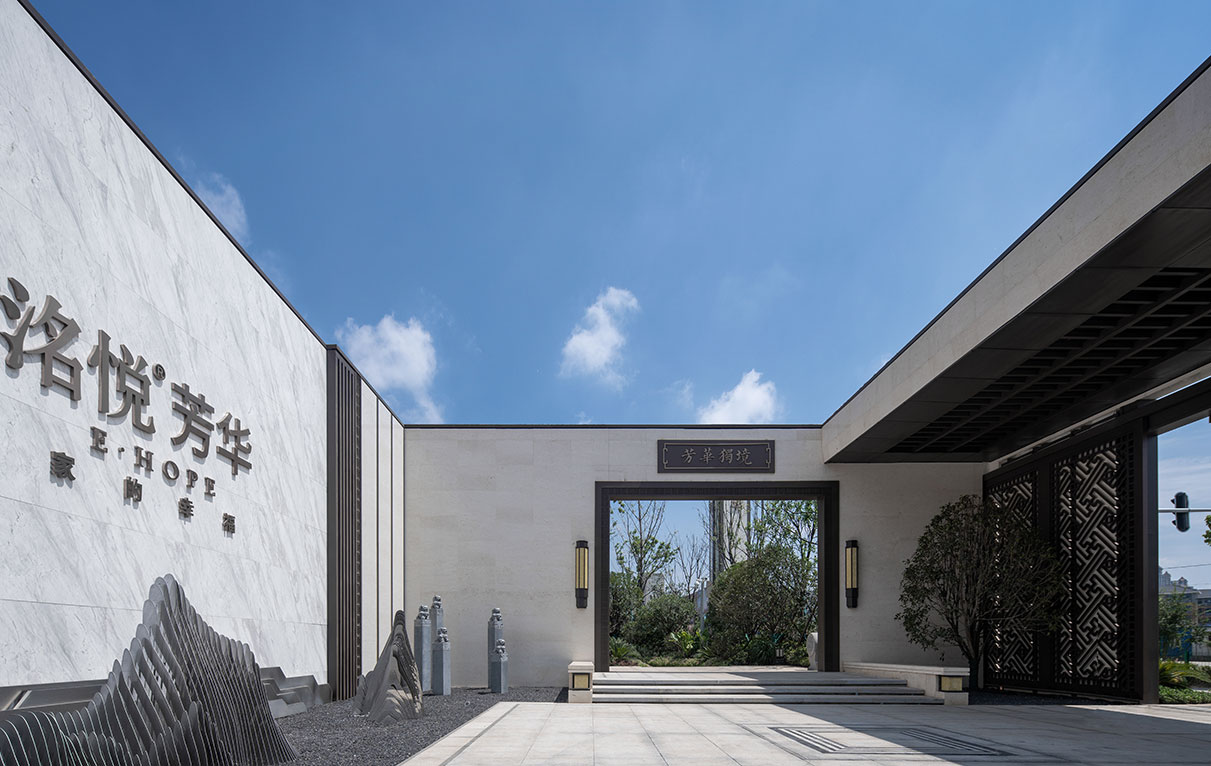 武漢洺悅芳華示范區位于湖北省武漢市經濟技術開發區,項目所屬區域在三環線以內為主城區。在項目場地中,商業建筑的南側與項目場地西南角距離較近,對示范區入口區域產生了干擾。因此,對示范區出入口方式的選擇是本項目的重中之重。另外,在現有場景中如何將“五進”空間融入到示范區內用景觀勾畫出空間的秩序,同時營造出新中式景觀的神韻感,這也是項目的一大挑戰。