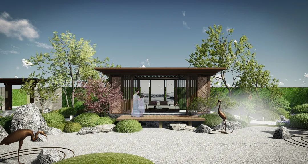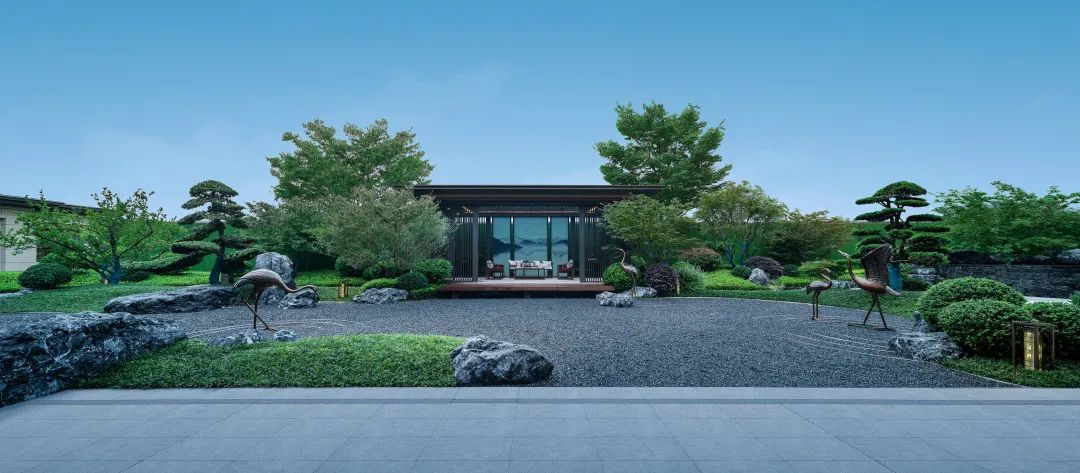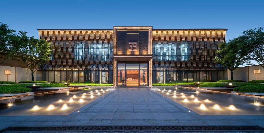 穿過售樓處建筑,豁然開朗,整個后場營造了一個極為簡潔純粹的空間,隨著晨昏的時間變化,交織的光影在景亭和水面上作畫,只為營造純粹的東方美學意境,整個庭院猶如一幅持續變化著的山水畫卷。
