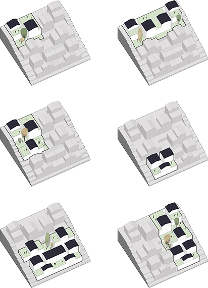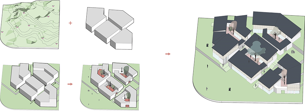 由不同大小16戶組成的合院模塊,以實(shí)現(xiàn)小面積、多組合、可經(jīng)營(yíng)的運(yùn)營(yíng)策略。建筑與山形產(chǎn)生共振,布局順應(yīng)地勢(shì),形成不同高程不同形式的入戶空間,做到每戶均有獨(dú)立的入戶和私家庭院,入戶流線移步異景,體驗(yàn)豐富。