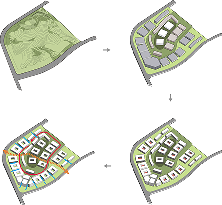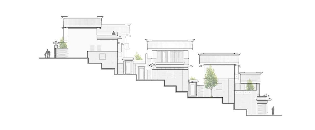 整體規(guī)劃采用大開放小圍合的設(shè)計(jì)理念,開放的山街步道與相對(duì)獨(dú)立的組團(tuán)合院,形成空間的收放韻律。設(shè)計(jì)尊重原始地形,建筑順應(yīng)地勢(shì)而建,由一個(gè)個(gè)標(biāo)準(zhǔn)組團(tuán)及精品民宿區(qū)形成覆蓋山丘的山居聚落,橫向山街與縱向的上山步道,將各組團(tuán)有機(jī)的聯(lián)系在一起,建筑低矮地趴在山丘上,傳承著”覆壓三百余里,隔離天日“的中國(guó)傳統(tǒng)組群院落精神,連續(xù)流動(dòng)且橫向漂浮著。