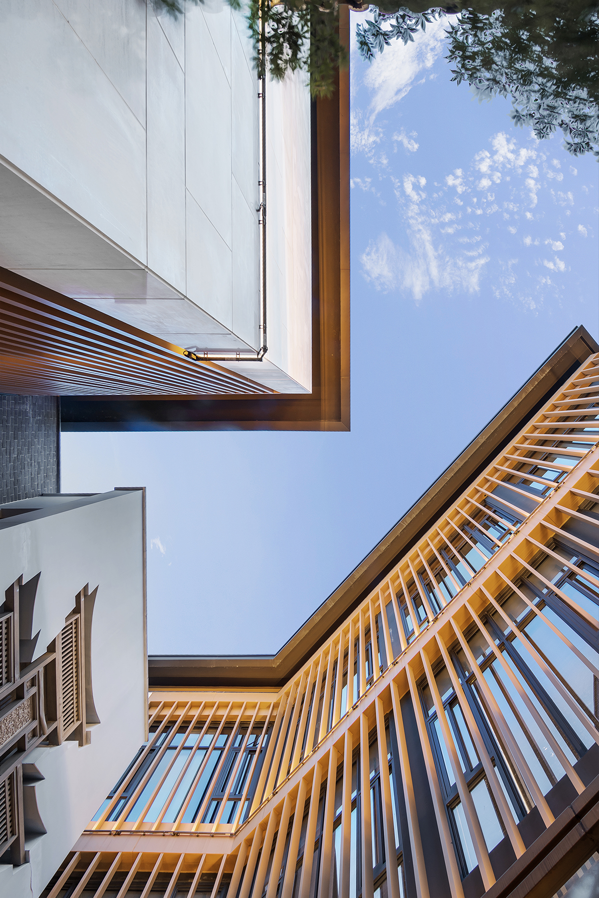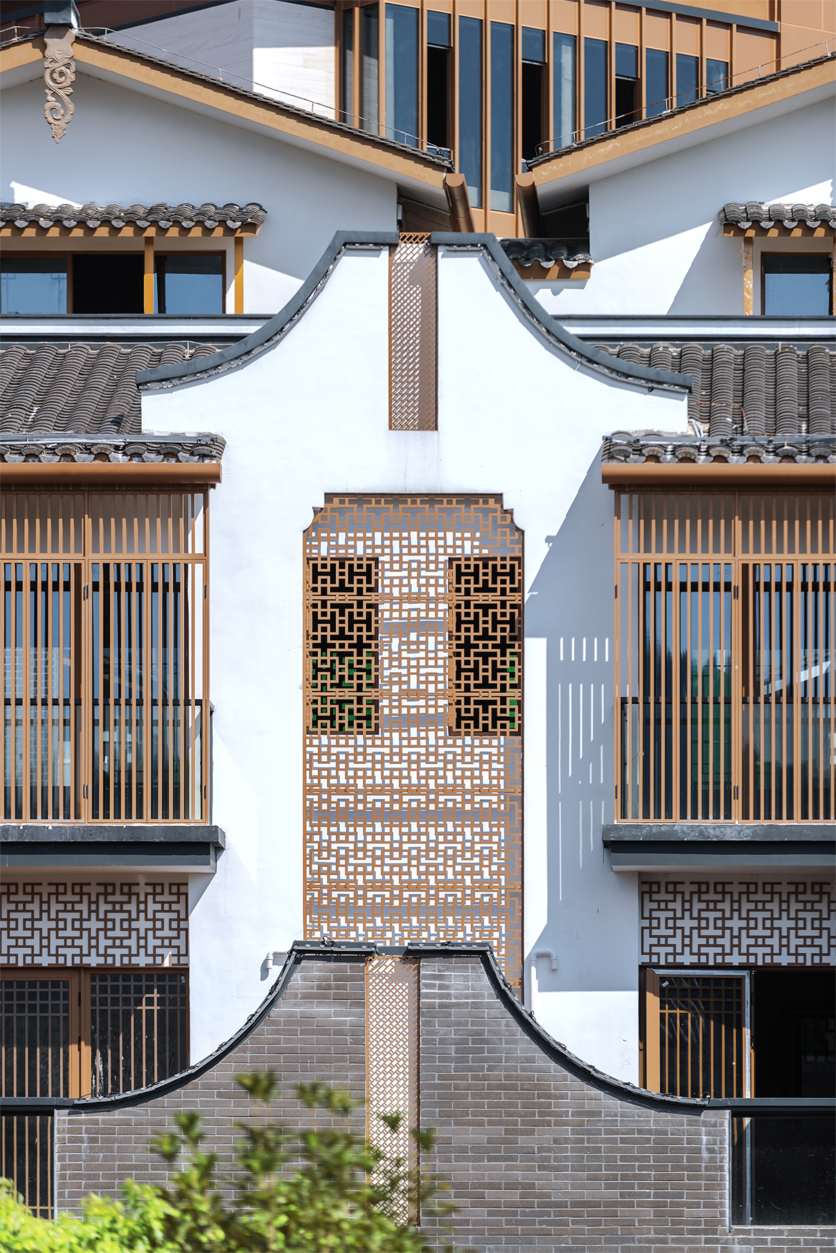 建筑形式錯(cuò)落有致,使得每棟均有良好視野, 游走于組團(tuán)之間,仿佛置身于”廊腰縵回,檐牙高啄;各抱地勢(shì),鉤心斗角“的傳統(tǒng)空間中。