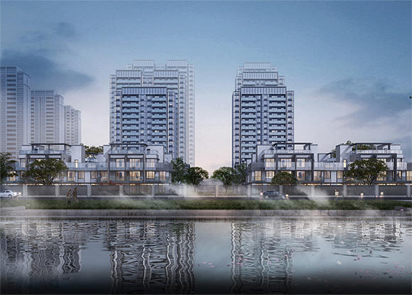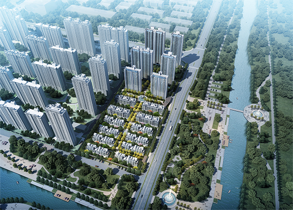 項目位于浙江省樂清市中心區,地處城市景觀雙軸交匯點。南側緊鄰城市綠軸,東側經濱海公園遠眺樂清灣,擁有便利的親水環境。依托良好的周邊景觀資源,采用南低北高的規劃形態,豐富濱海城市天際線,從人居角度出發,減少高層對城市主軸帶來的壓迫感。