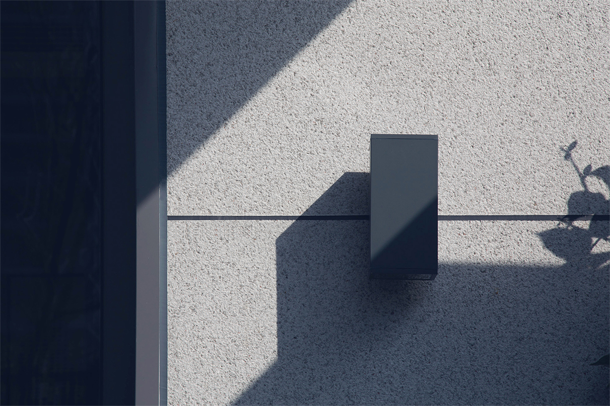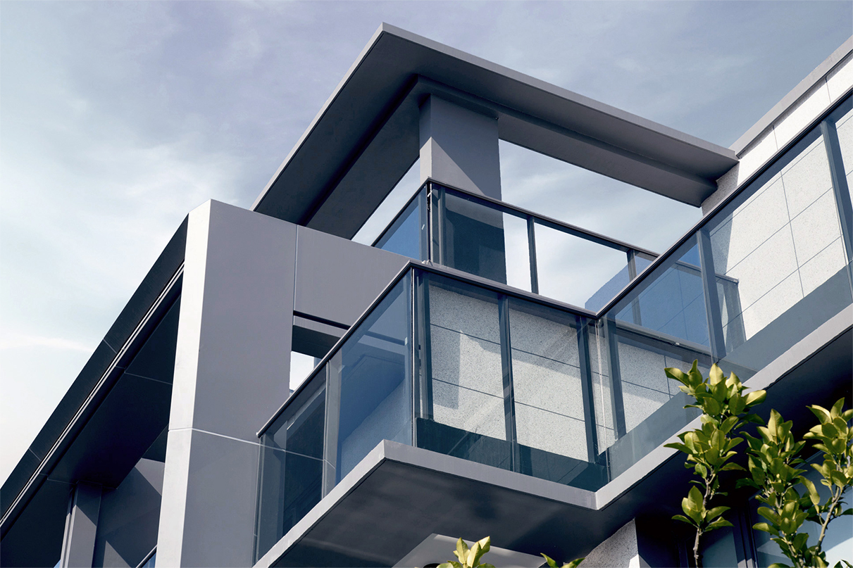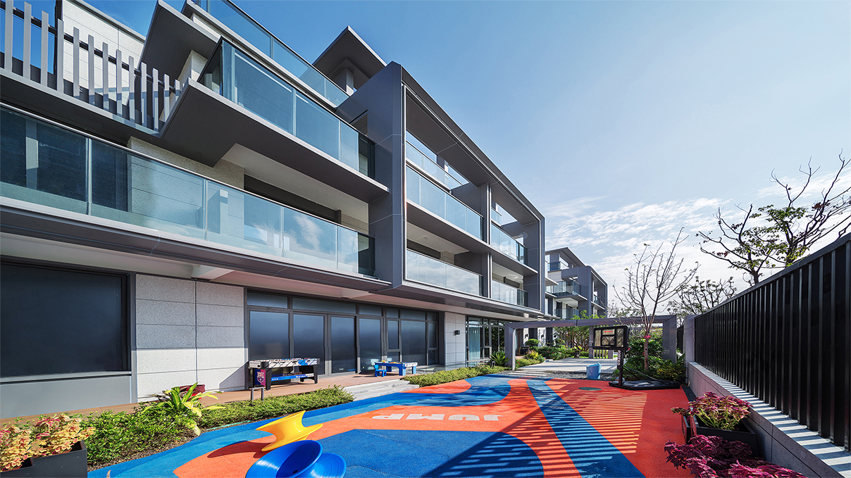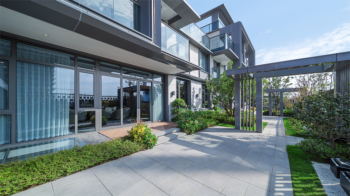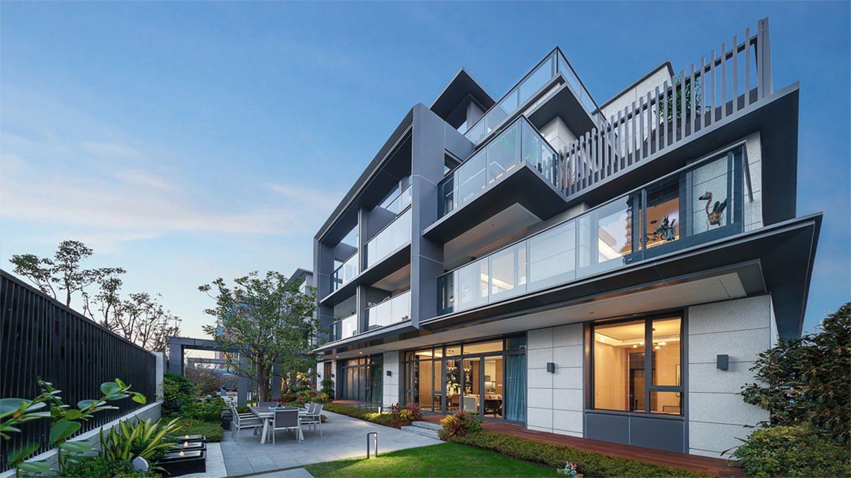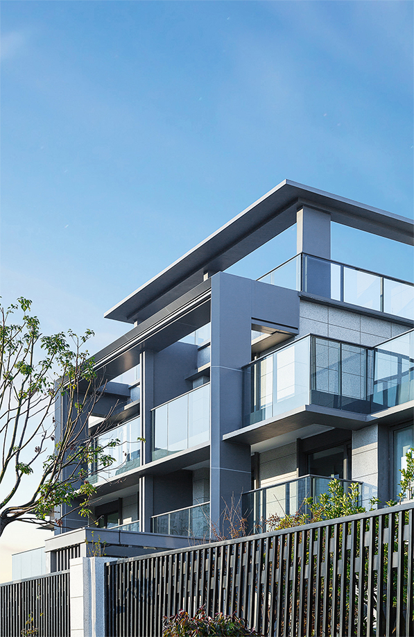 東方禪意與西方現代建筑對理性簡約美的崇尚,在審美價值觀層面水乳交融,形成了獨特的現代典雅建筑風格?,F代典雅住宅建筑端莊大氣,設計圍繞“純凈簡潔、輕盈飄逸”的理念,減少材料的種類,弱化了構件的厚度,突顯形體的輕盈挺拔。每個形態單元的構圖關系因此簡化為白色墻面與玻璃之間大實大虛的鮮明對比。為塑造形體輪廓的輕盈挺拔,建筑立面主要的豎線條,均做內收三角形斜切處理,并以鋁型材收邊。不同材質的精美交接,使形體轉折更加明確,賦予建筑冷峻的骨感美。